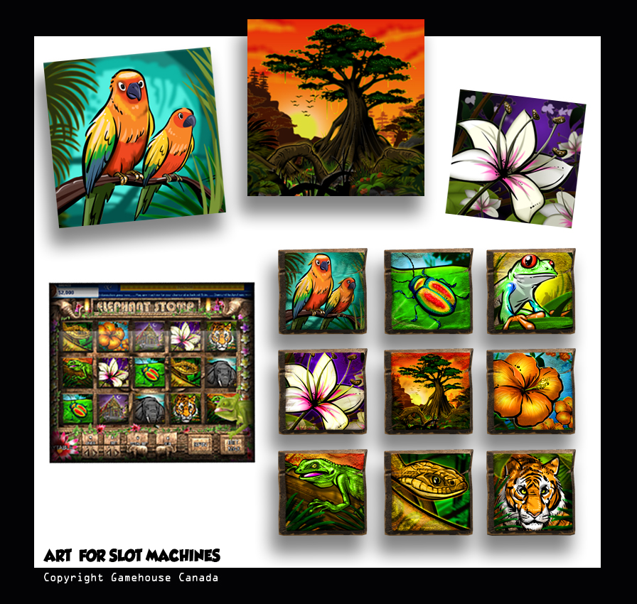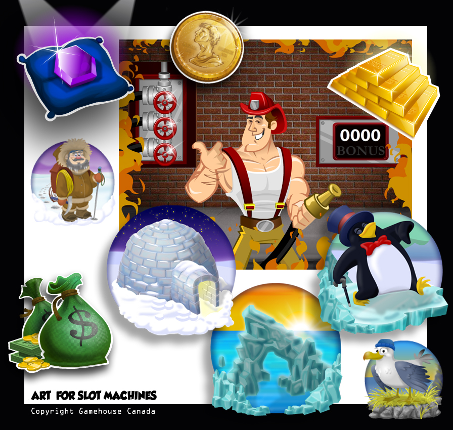 Game assets designed for mobile games/ slot machines while at Backstage Games/ Gamehouse Canada