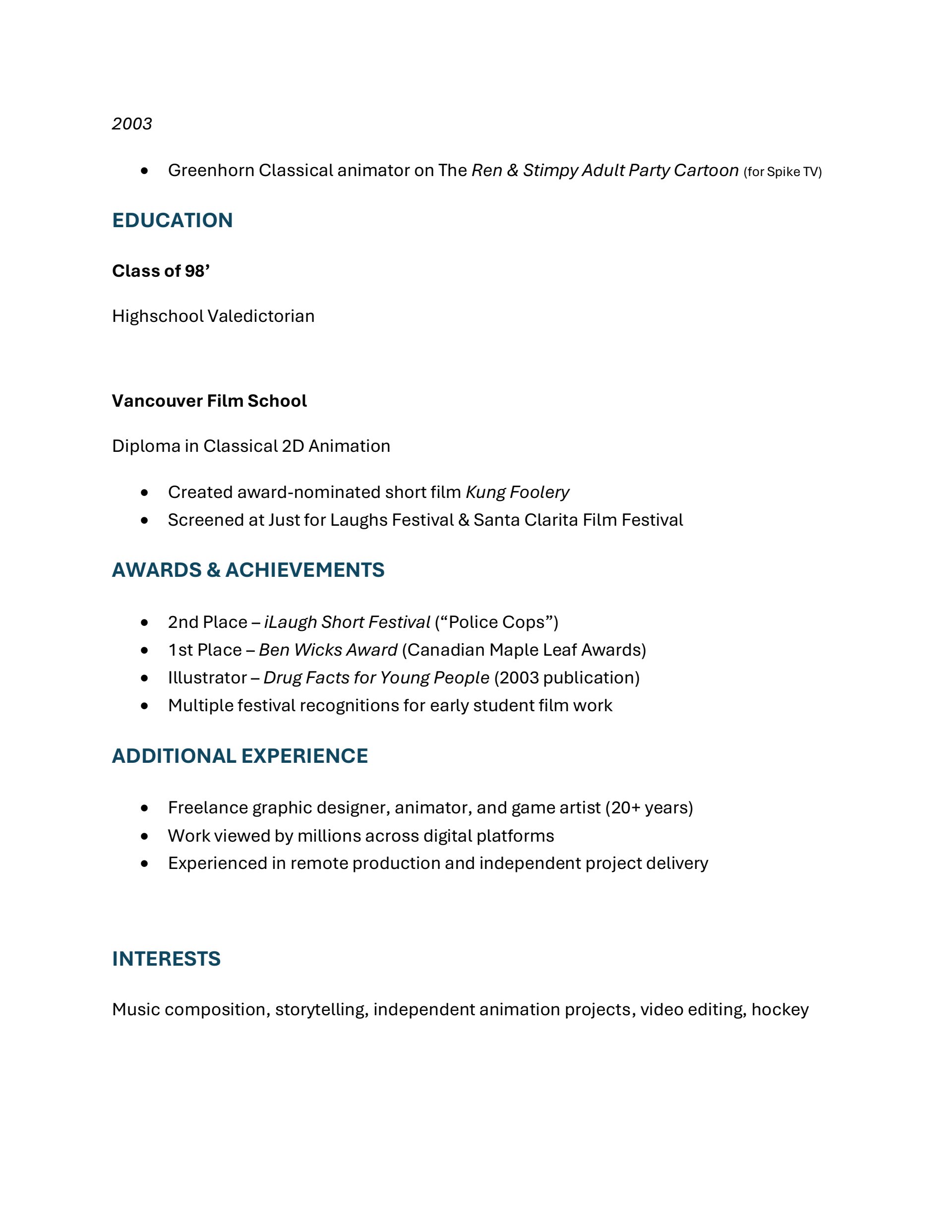 Post high-school, he enrolled at Vancouver Film School for Classical Animation in 2001, and his animated short film, “Kung Foolery” was screened and nominated at the BC Film Festival, the Santa Clarita Film Festival, and the "Just for Laughs Festival" in Montreal.